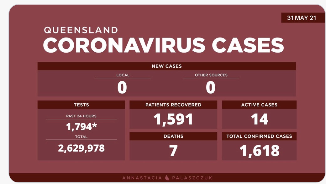 5月31日星期一- 昆士兰的冠状病毒病例更新: - 0例新的本地感染病例 - 0例海外感染病例 - 14例活动病例 -累计确诊 1,618例 - 进行了2,629,978次测试 不幸的是,7名COVID-19患者已经死亡。1,618名患 ...