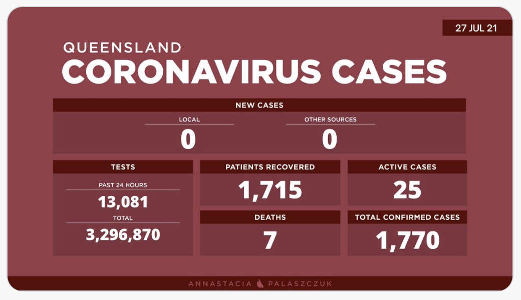 7月27日星期二- 昆士兰的冠状病毒病例更新: - 0例新的本地感染病例 - 0例海外感染病例 - 25例活动病例 -累计确诊 1,770例 - 累计进行了3,29,6870次核酸测试 图文来源:twitter 原文链接