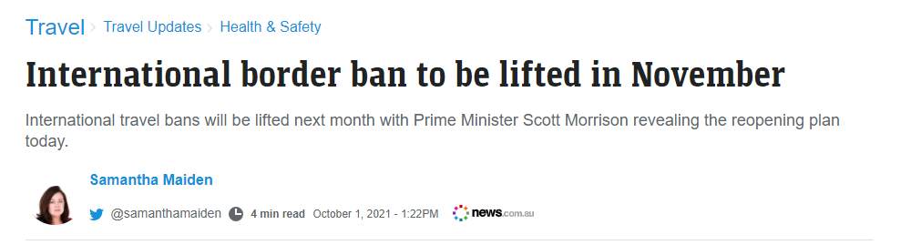 澳洲总理斯科特-莫里森宣布,随着各州进入80%的疫苗接种率,澳大利亚的国际边境禁令将在11月结束。 于此同时,愤怒的昆士兰州长表示,在今天早上计划的消息公布之前,莫里森没有告诉她关于提前重新开放国际边境 ...