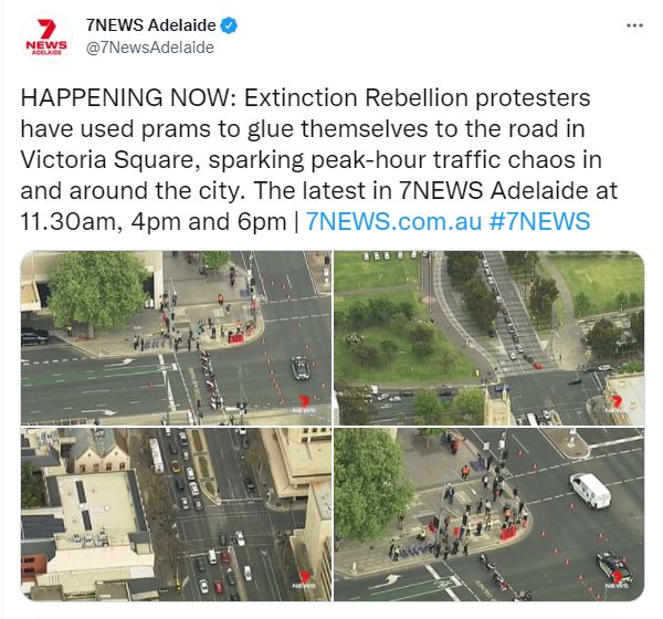 今天(周三)早上,在阿德莱德CBD维多利亚广场,一群气候抗议者将自己锁定并粘一排婴儿车上,严重阻碍了高峰时段的交通。 图文来源:7 News 原文链接