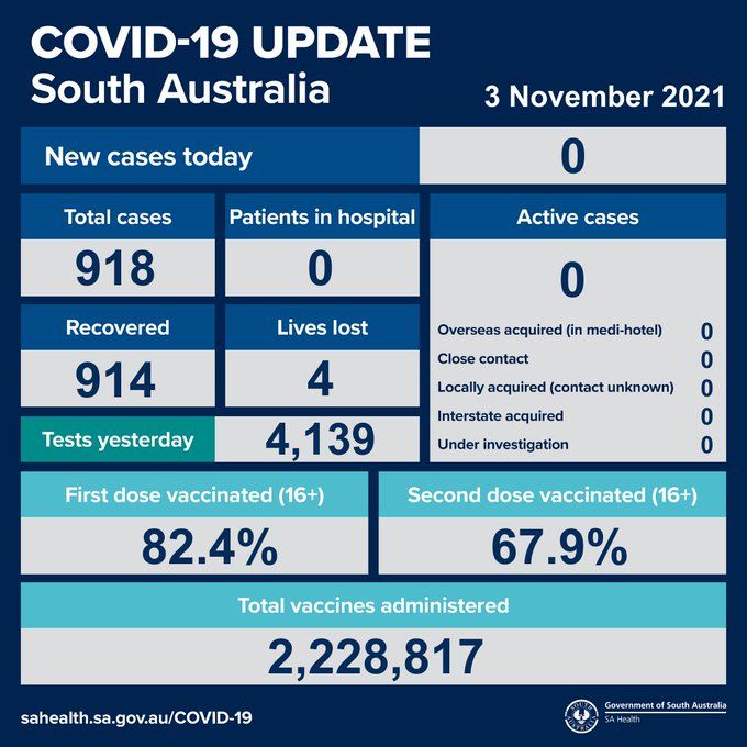 2021年11月3日,星期三,南澳新冠病例情况更新如下: 无新增确诊病例; 活跃病例0例,无患者在医院中康复与治疗。 ​ 共康复914例,死亡4例。 昨日共进行检测4139次。 图文来源:SAHealth ...