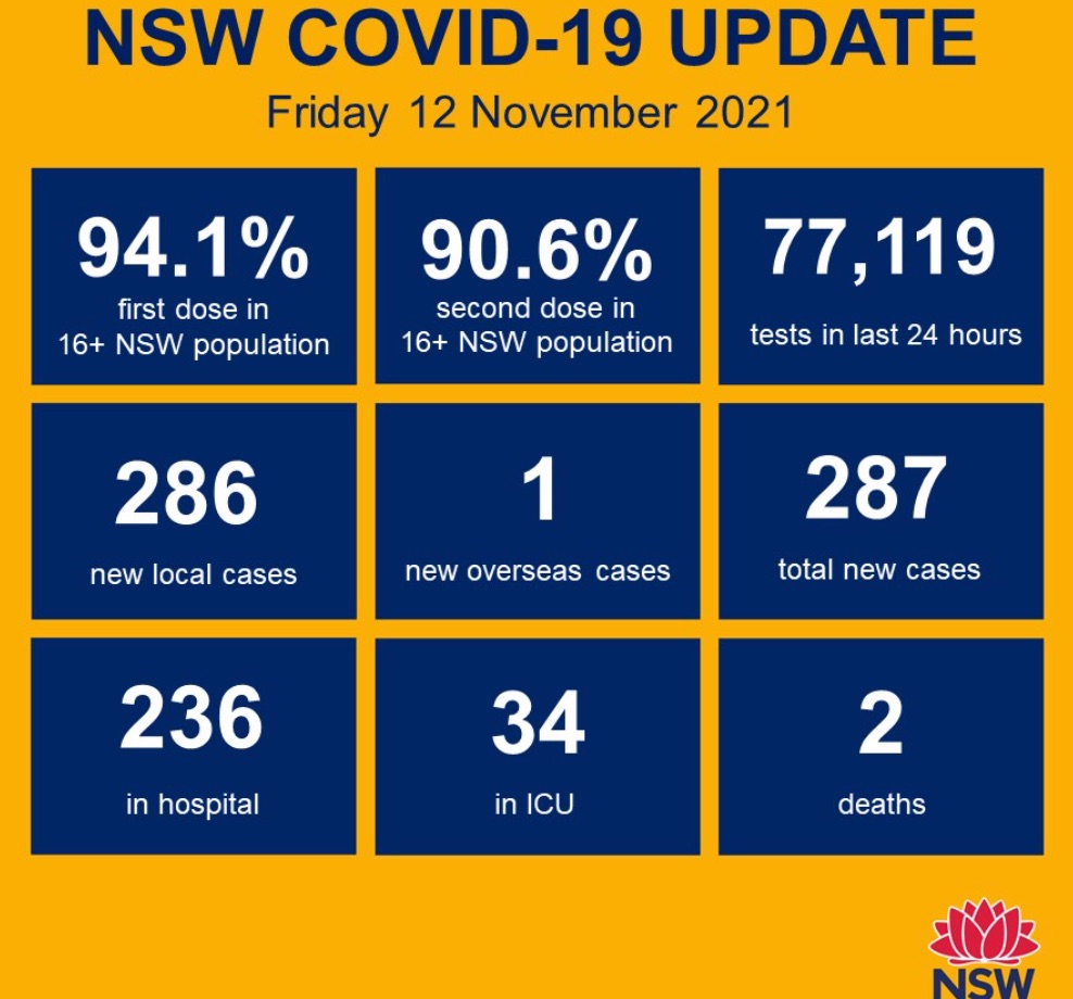 截止周四20:00的24小时内,新州录得286例本土新增确病例,一例海外输入病例,2例死亡。 目前有236名COVID-19患者住院,其中34人在ICU。 昨天共进行了77,119次测试,比前一天的77,009次略有增加。 随着最后 ...
