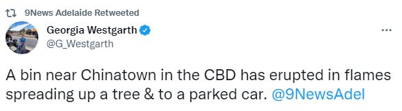 突发! 位于阿德莱德CBD的中国城附近的一个垃圾桶起火! 消防人员已赶到现场,紧急采取行动。 后续我们会跟进相关报道。 图文来源:9 News