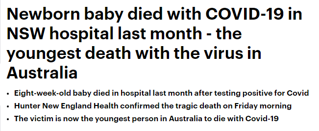 一名八周大的婴儿在感染Covid后死亡,这被认为是澳大利亚年龄最小的Covid死亡病例。 她说:"我已经和他们的家人谈过,他们的家人非常希望他们的隐私得到保护。" "你可以想象,这是一个家庭可能经历的最 ...
