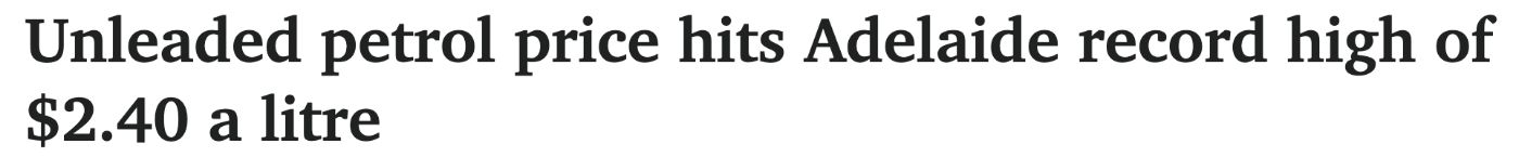 阿德莱德无铅汽油价格创历史新高,为$2.4/升。 南澳最高汽车机构RAA敦促驾驶者,如果无铅汽油价格为$2/升,就去加油。 RAA发言人Mark Borlace说:"驾驶者可以使用我们免费的myRAA应用程序 ...