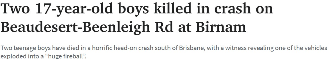 两名17岁男孩在周日晚上布里斯班南部的一场迎面撞车事故中丧生,一名目击者表示其中一辆车爆炸。 这位不愿透露姓名的女士表示:"他们不知道有一辆银色的车正向Beaudesert方向驶去。”她说 ...