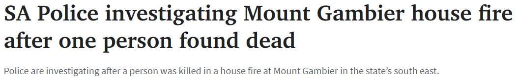 南澳一住宅发生火灾,一人死亡,事故原因正在调查中! 南澳东南部Mount Gambier一房屋发生火灾,造成一人死亡,警方正在调查起火原因。 大火在大约20分钟内被扑灭,有三支MFS救援队和一支CFS救援队参 ...
