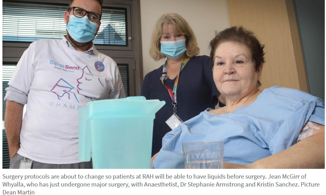 Royal Adelaide Hospital的手术病人在被推进手术室之前,可以一直饮用水或者饮料,这对禁水协议的改变具有里程碑式的意义。 "Sip Til Send"计划允许病人在手术前每小时饮用200毫升液体。 病人可以 ...