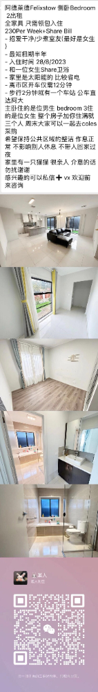 阿德莱德Felixstow 侧卧Bedroom 2出租,新take的房子,全家具 只需领包入住如图所示,联系在图片下方的二维码