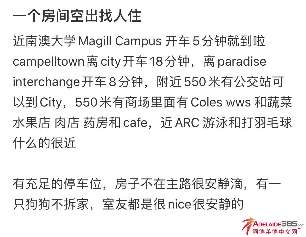 单间长租 2.28~3.3可入住 好房不要错过啦~距离南澳大学Magill 校区开车5分钟,去阿大开车18分钟 至少半年起租 抱歉暂不接受短租/情侣/其他宠物 四房两卫,住满四人 VX同0460661543