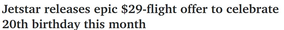 据悉,捷星航空宣布在其整个澳大利亚网络内推出大规模的庆祝促销活动,起价仅为29澳元。 29澳元起的票价数量有限,包括: 墨尔本(Tullamarine)至Whitsunday Coast 布里斯班至Newcastle 悉尼至 ...
