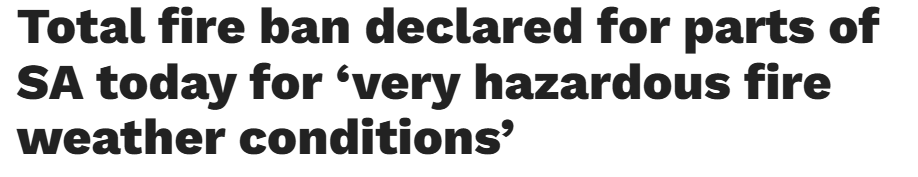 据报道,南澳Mount Lofty Ranges地区的居民今日被提醒务必格外谨慎,该区域已宣布实施全面禁火令,极端火灾天气即将来袭。 CFS将Mount Lofty Ranges地区火灾风险等级评定为极端,这意味着只有准备充分、结构 ...