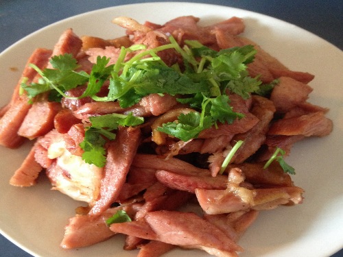 炒火鸡腿肉,烧茄子,饭后一个果盘配炼奶