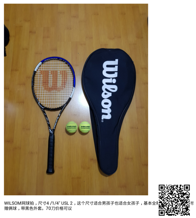 网球拍,基本全新,只用过一次。尺寸:4 1/4‘’ USL 2。尺寸非常好,拍子很轻,适合初学者。男女均可。 黑色外套赠俩球。70刀