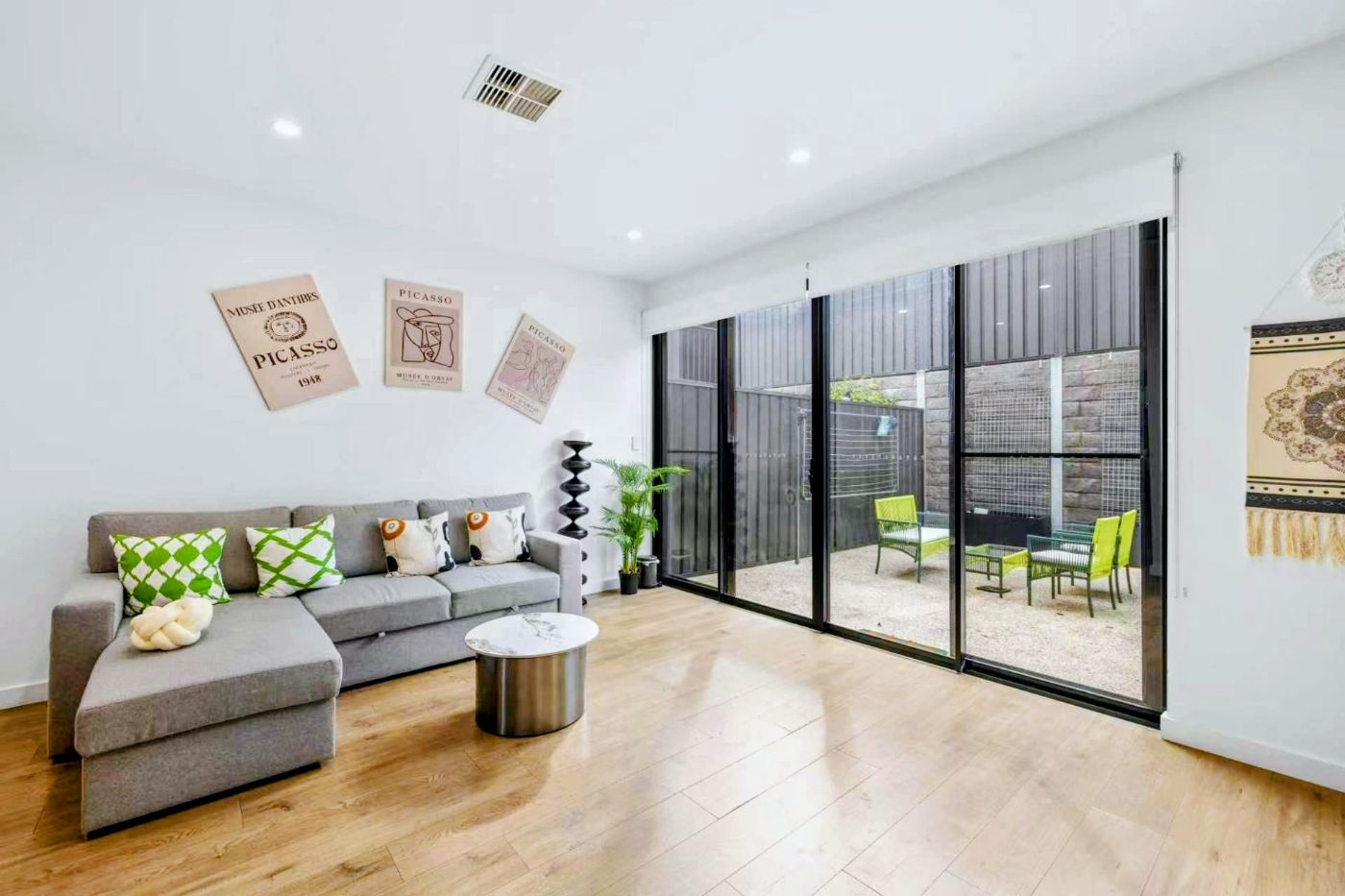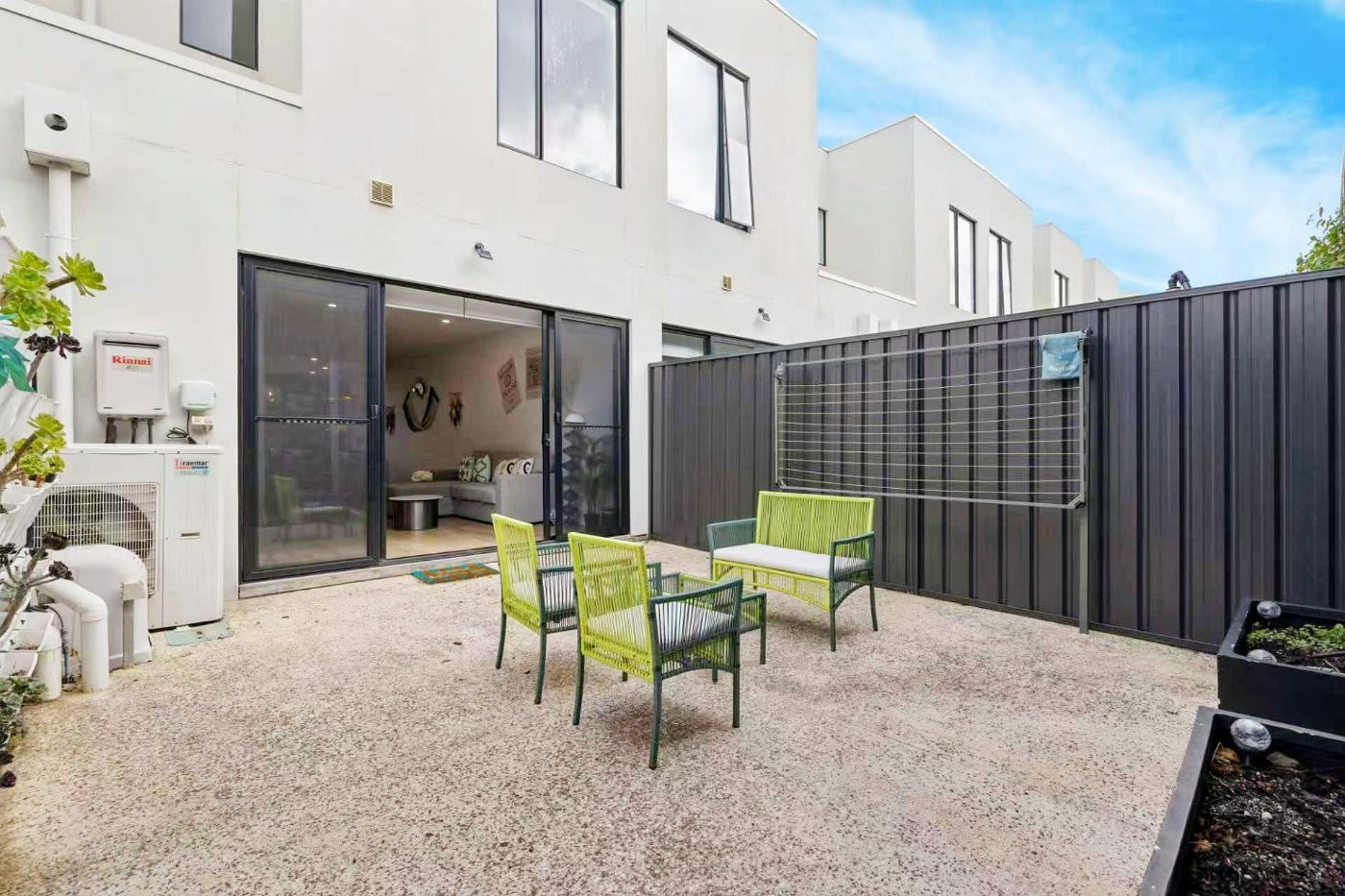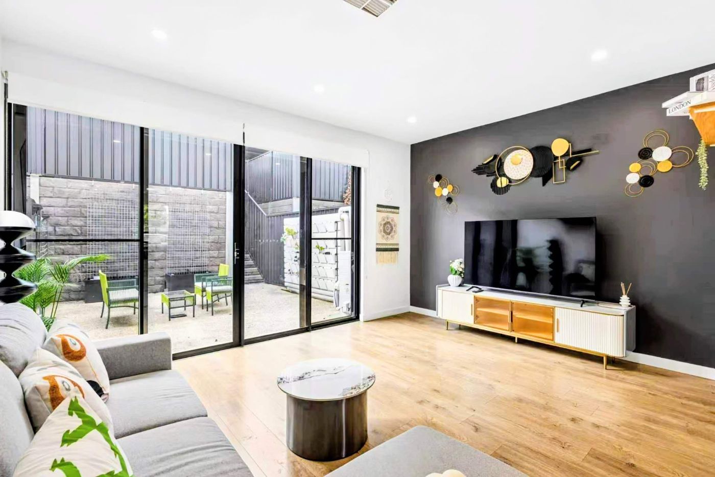 落地玻璃门将室内自然延伸至私密后院庭院,营造理想的室内外生活体验。晨起一杯咖啡,午后享受静谧时光,或周末与亲友小聚,这里皆可从容承载生活的美好。