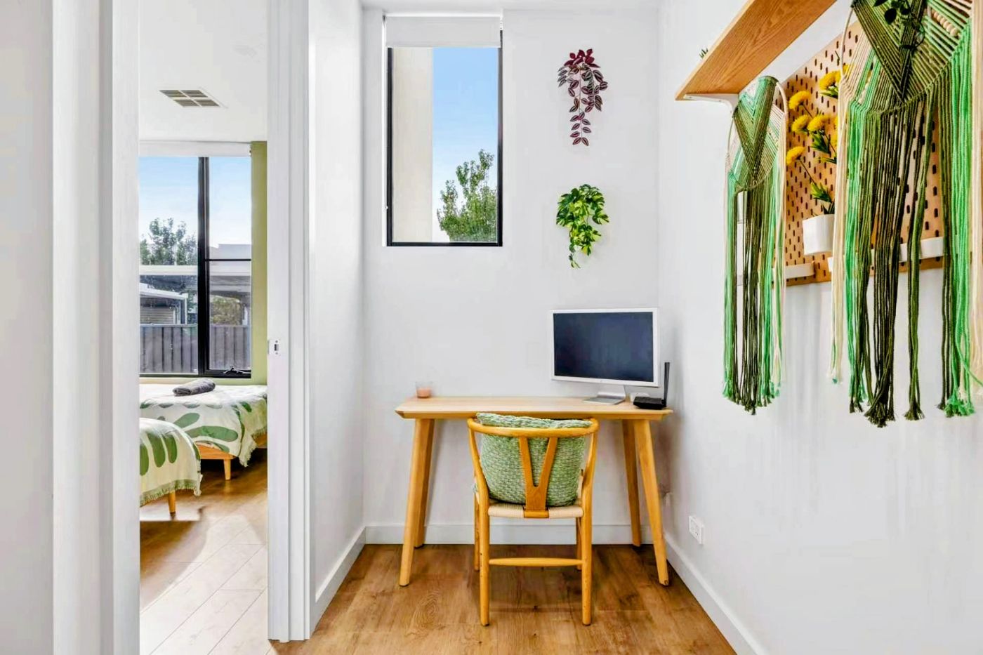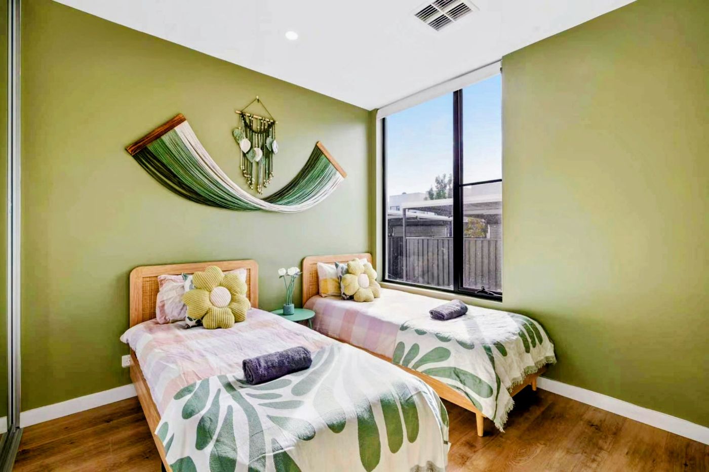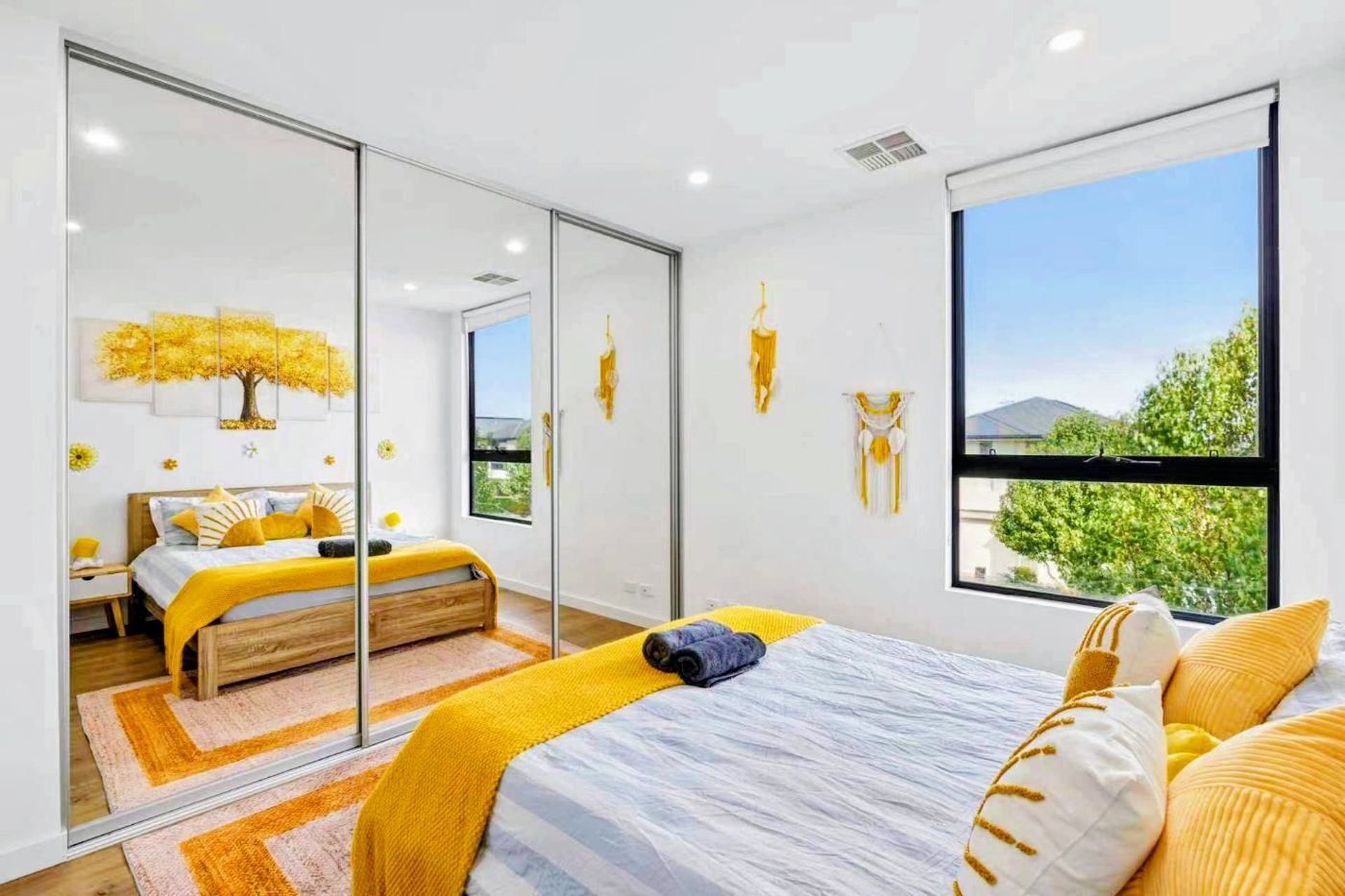 楼上设有两间宽敞卧室,各具风格与温度。次卧色彩鲜明,充满创意与活力;主卧则拥有独立卫浴套间及内置衣柜,享受专属宁静空间。