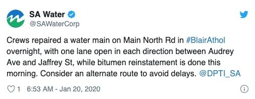 今天早上,Main North Rd上有三处水管破裂,市政正在抢修。 其余时间都是最高温度二十几度的好天气,适合出行。