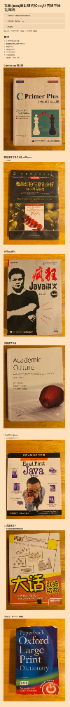 # 书籍-java/数据结构/C++/语言班苹果书/字典 主要是关于计算机和语言班用的书籍 所有书籍一律9AUD,不刀 city自取 联系方式:0416438864 (短信),wikiizhan(微信) # 总结 1. C primer plus 第六版 2. ...