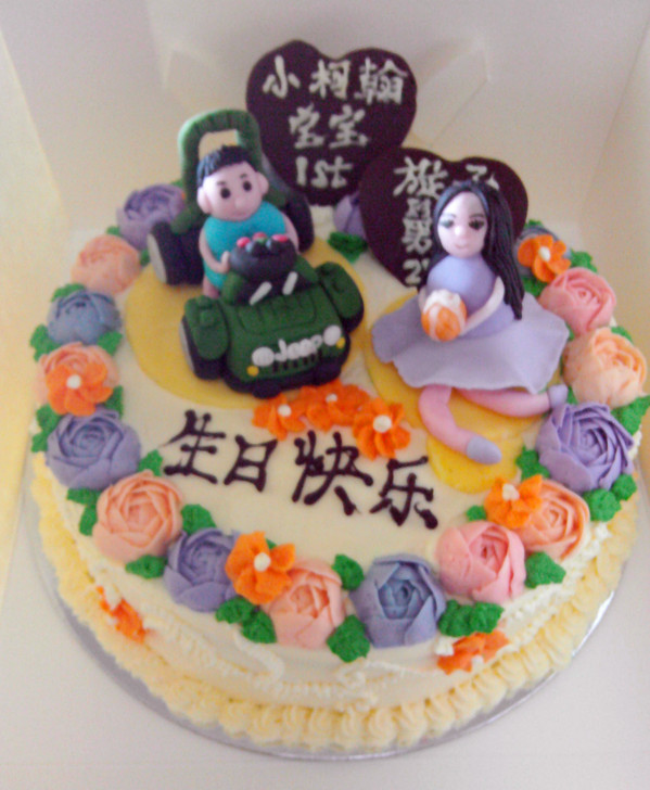 小朋友和他舅妈正好同一天生日,一岁的宝宝最爱他的玩具jeep车,花样年华的舅妈当然要送玫瑰,所以就有这个蛋糕。戚风香草蛋糕体,意式奶油霜裱的含苞待放的玫瑰做围边,翻糖捏了车车和人偶,巧克力生日牌!为了防潮 ...