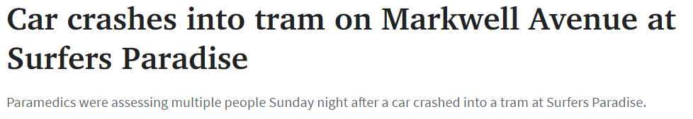 一汽车在Surfers Paradise的Markwell Avenue上撞上有轨电车!