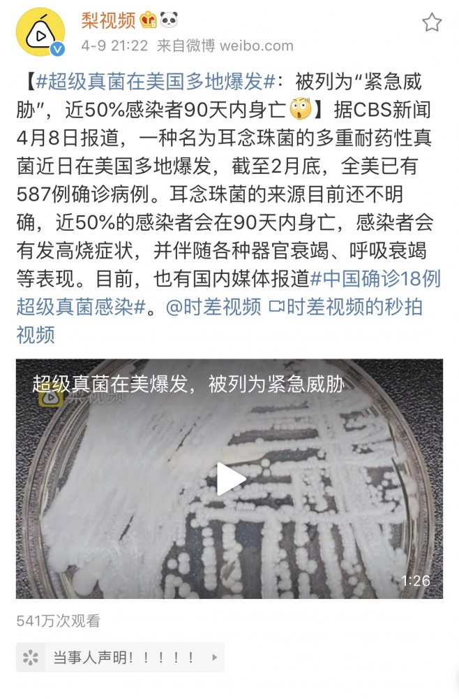 最近有一种超级真菌肆虐全球! 神秘且高致死率! 耐药性极强! 美国已大面积爆发! 中国也有18人确诊! 由于天气原因,最近澳洲很多地方都霉菌肆掠,发生了多起因霉菌影响健康的事情。大家千万不要小觑霉 ...
