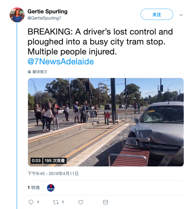 就在刚才! 光天化日之下, 一辆小轿车突然失控,一头栽进了阿德莱德的tram站台! 请各位计划乘坐tram的朋友们,注意交通变化,及时调整出行。