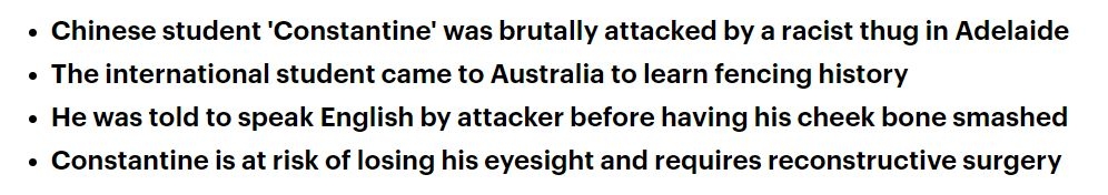 阿德莱德中国留学生被当街殴打!颧骨粉碎!或失明! 一名种族主义暴徒袭击了一名中国留学生致使他面部颧骨粉碎,只因为他说普通话。 这名学生上周六在阿德莱德的街道上行走时,一名男子突然靠近了他并命令他说英 ...