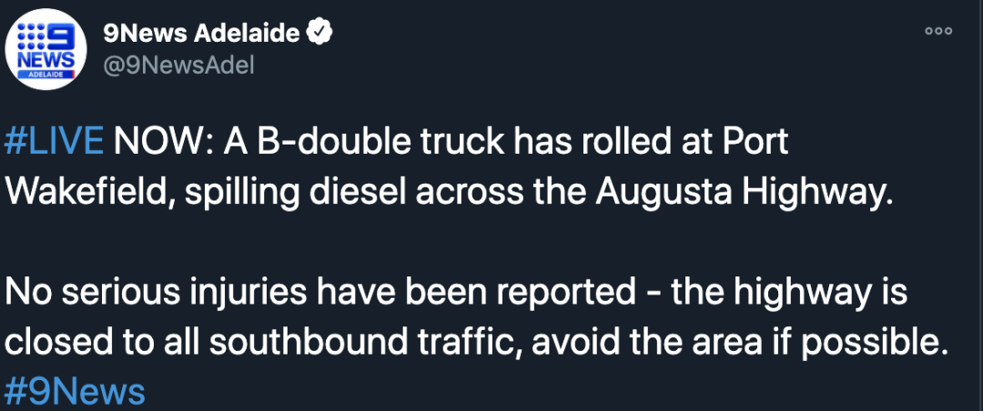 快讯! 一辆大卡车在Augusta Highway行驶时于Port Wakefield附近发生侧翻,柴油泄漏到公路上。 文章来源:9 news