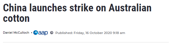 继大麦、牛肉、煤炭和葡萄酒之后,澳大利亚棉花种植者可能成为与中国日益激烈的贸易紧张关系的最新受害者。 澳大利亚棉花协会和棉花托运人协会正在与联邦政府合作,调查到底发生了什么。 “澳大利亚棉花行业将 ...