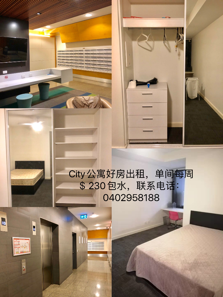 City公寓好房,出租单间,每周$230包水。联系电话:0402958188