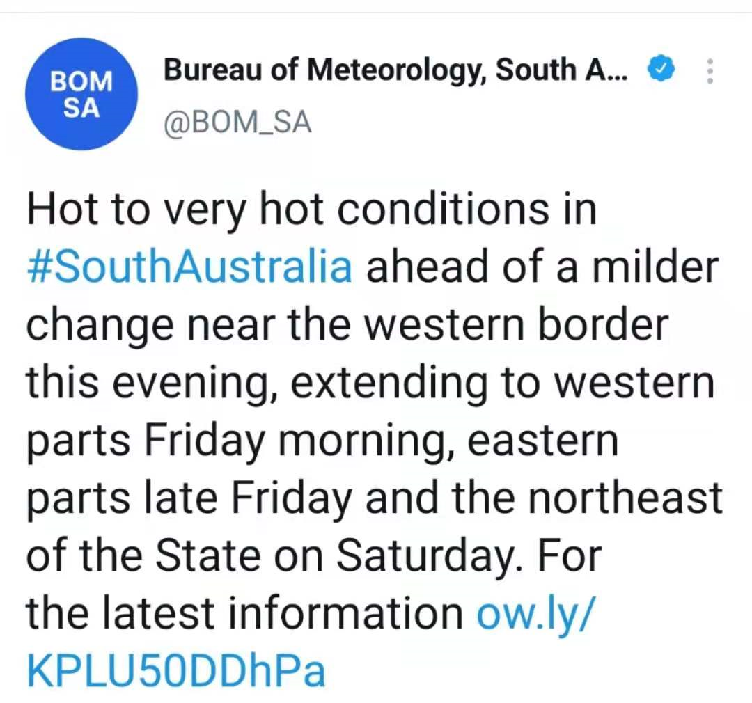 据报道,今日南澳气象局发布了周五至周六的高温预警,预计局部地区的温度将超过40摄氏度。 新闻来源:BOM SA