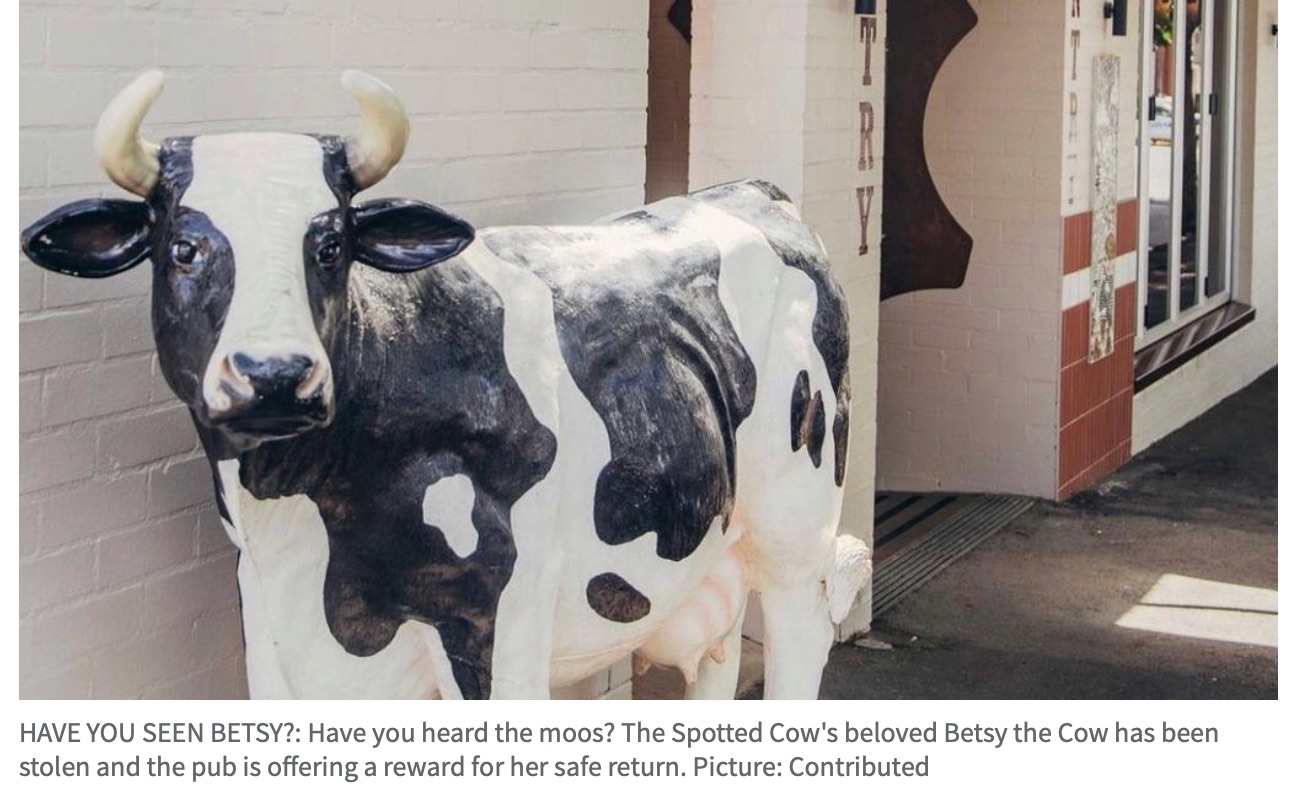 Toowoomba最著名的酒吧之一,Spotted Cow Hotel正在呼吁公众帮助他们寻找镇店之宝--一只斑点奶牛吉祥物Betsy,因为她在4月16日星期五的凌晨从酒吧外被盗。 图文来源:Couriermail 原文链接
