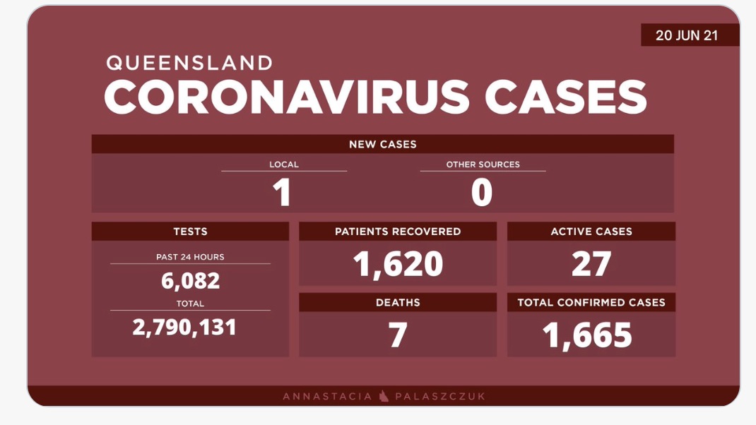 6月20日星期日- 昆士兰的冠状病毒病例更新: - 1例新的本地感染病例(为此前确诊病例的密接) - 0例海外感染病例 - 27例活动病例 -累计确诊 1,665例 - 累计进行了2,79,0131次核算测试 不幸的是,7名 ...