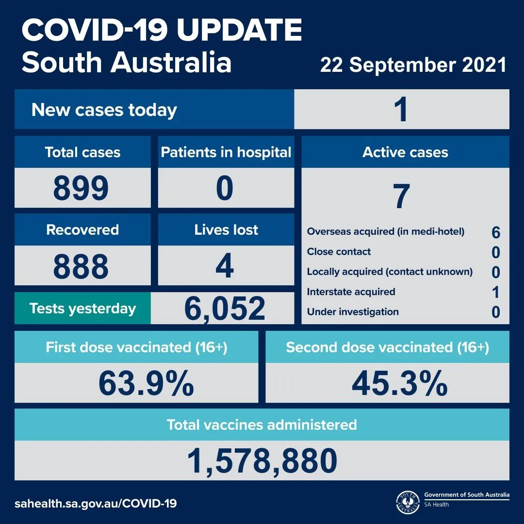 2021年9月22日,星期三,南澳新冠病例情况更新如下: 新增确诊病例1例!为海外输入病例! 活跃病例7例,无患者在医院中康复与治疗。 共康复888例,死亡4例。 昨日共进行检测6052次。 第一针疫苗接种率为6 ...