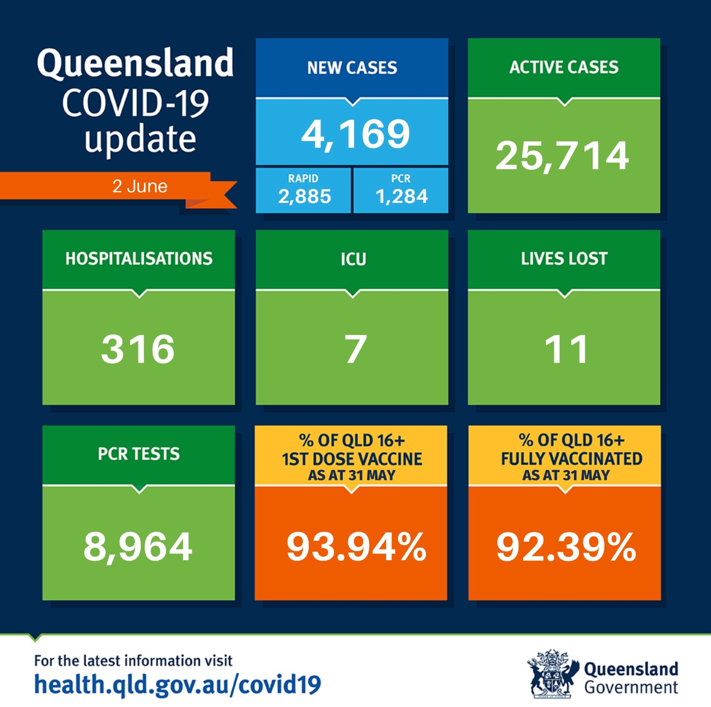 在过去24小时里,昆州新增4169例,11人死亡。 其中PCR检测1284例,快速检测2885例。 目前全州活跃病例为25714例。 共有316人因covid住院,7人住在重症监护室。 全州16岁以上人群两针接种率为92.39%。 图 ...