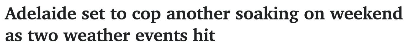 冷锋到来将使阿德莱德气温下降,雨量增加,又是一个潮湿的周末。 随着气温下降到13°C,该市周六可能会有15毫米的降雨,周日可能会有25毫米的降雨。 周五和周六,气象局向南澳全州发布了海风警告。 本周气 ...