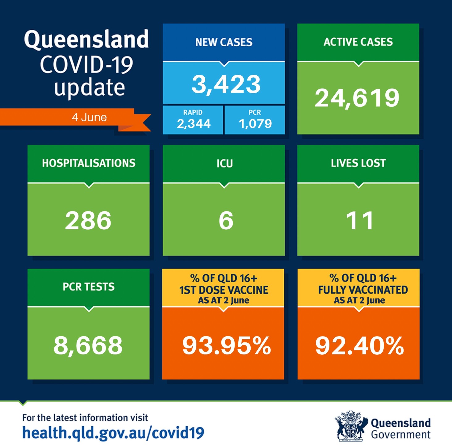 在过去24小时里,昆州新增3423例,11人死亡。 其中PCR检测1079例,快速检测2344例。 目前全州活跃病例为24619例。 共有286人因covid住院,6人住在重症监护室。 全州16岁以上人群两针接种率为92.40%。 ...