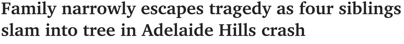 Adelaide Hills发生一起严重车祸,一家四兄妹撞上一棵树,造成两人住院,一家人险些酿成悲剧。 肇事车辆已被拖离现场,警方仍在对事故进行调查。 警方敦促任何目击者或有行车记录仪录像的人与警方联系。 ...