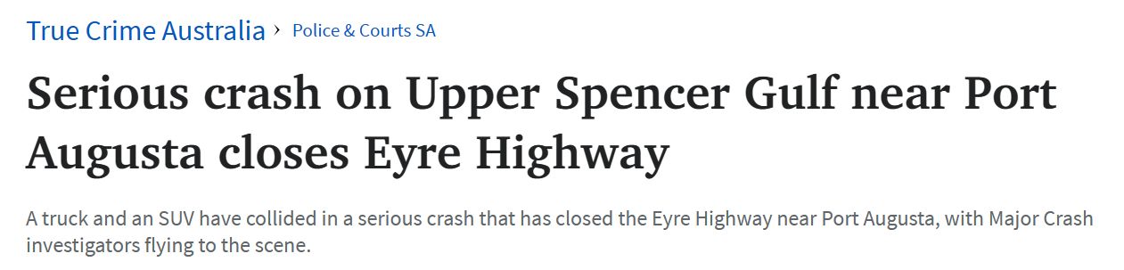 周二凌晨时分,一辆卡车和一辆SUV发生严重车祸,导致Port Augusta附近的Eyre Highway关闭,南澳重大车祸调查人员紧急赶往现场。 Caroona路不适合公路列车,他们需要停车。 图文来源:The Advertiser [url=& ...