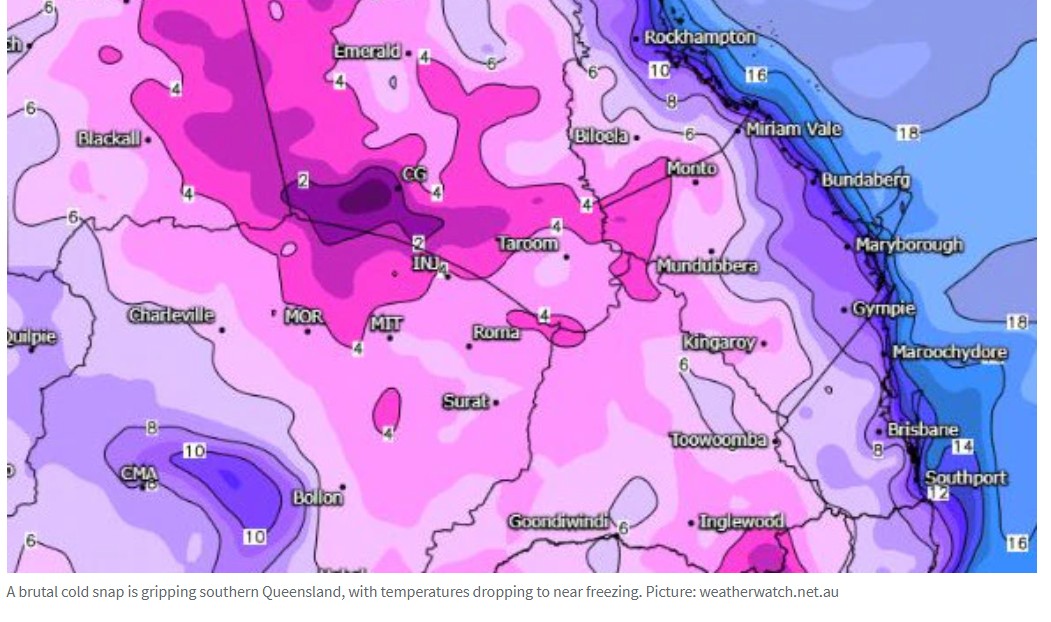 今晨,昆州南部的气温骤降,早上6点20分,Oakey的气温为0.4℃,成为昆州最冷的地方,而Dalby为1.3℃,Warwick为1.5℃,Wellcamp Airport为1.9℃。 早上6点30分,一些地方感觉更冷,Dalby为零下2.4℃,Roma ...
