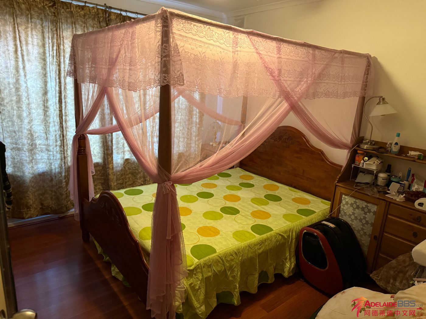 联系电话;0434285429 Queen size实木双人床架+幔帐180刀