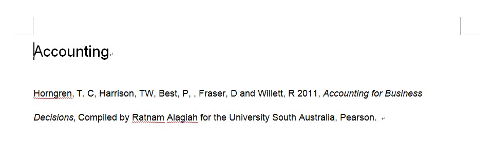 AccountingHorngren, T. C, Harrison, TW, Best, P, , Fraser, D and Willett, R 2011, Accounting for Business Decisions, Compiled by Ratnam Alagiah for the University South Australia, Pearson. 急需这本 ...