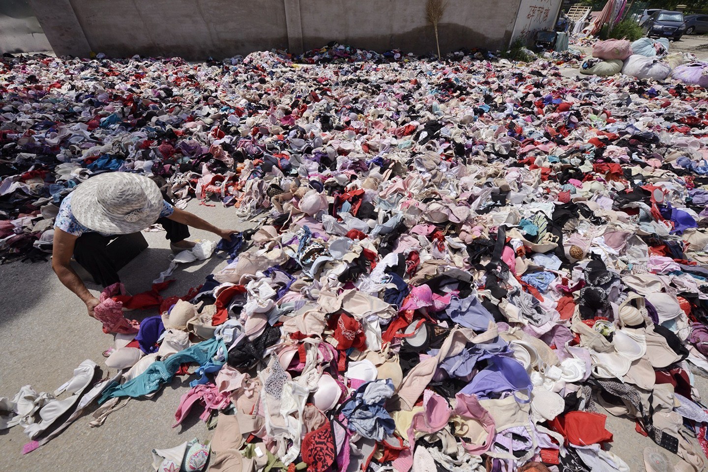 图为被弃置在地上准备分拣的废旧内衣。 2014年8月7日,北京,成寿寺路136号院的一处废品收购站遭市民举报称“院内晒了一地的文胸”。有市民担心这些旧文胸会流入市场再行售卖,影响女性健康。 ...